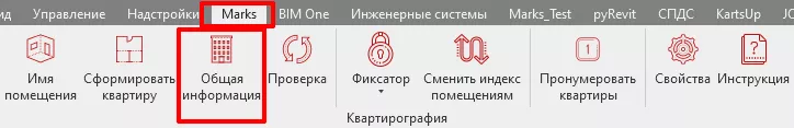 7. Назначьте общую информацию помещениям/квартирам плагином «Квартирография». Путь: MARKS-АР/Общая информация (см. Рис. 28, Рис. 29).