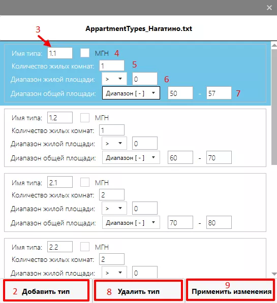 9 – После добавления/удаления/изменения типов квартир необходимо применить изменения.