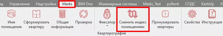 9. При изменении конфигурации здания вы можете изменить индексацию помещений/квартир используя кнопку «Сменить индекс помещениям» плагина «Квартирография». Путь: MARKS-АР/Сменить индекс помещениям (см. Рис. 32 ).