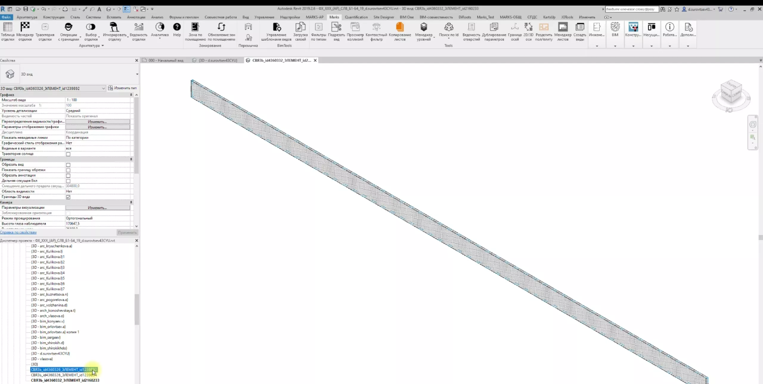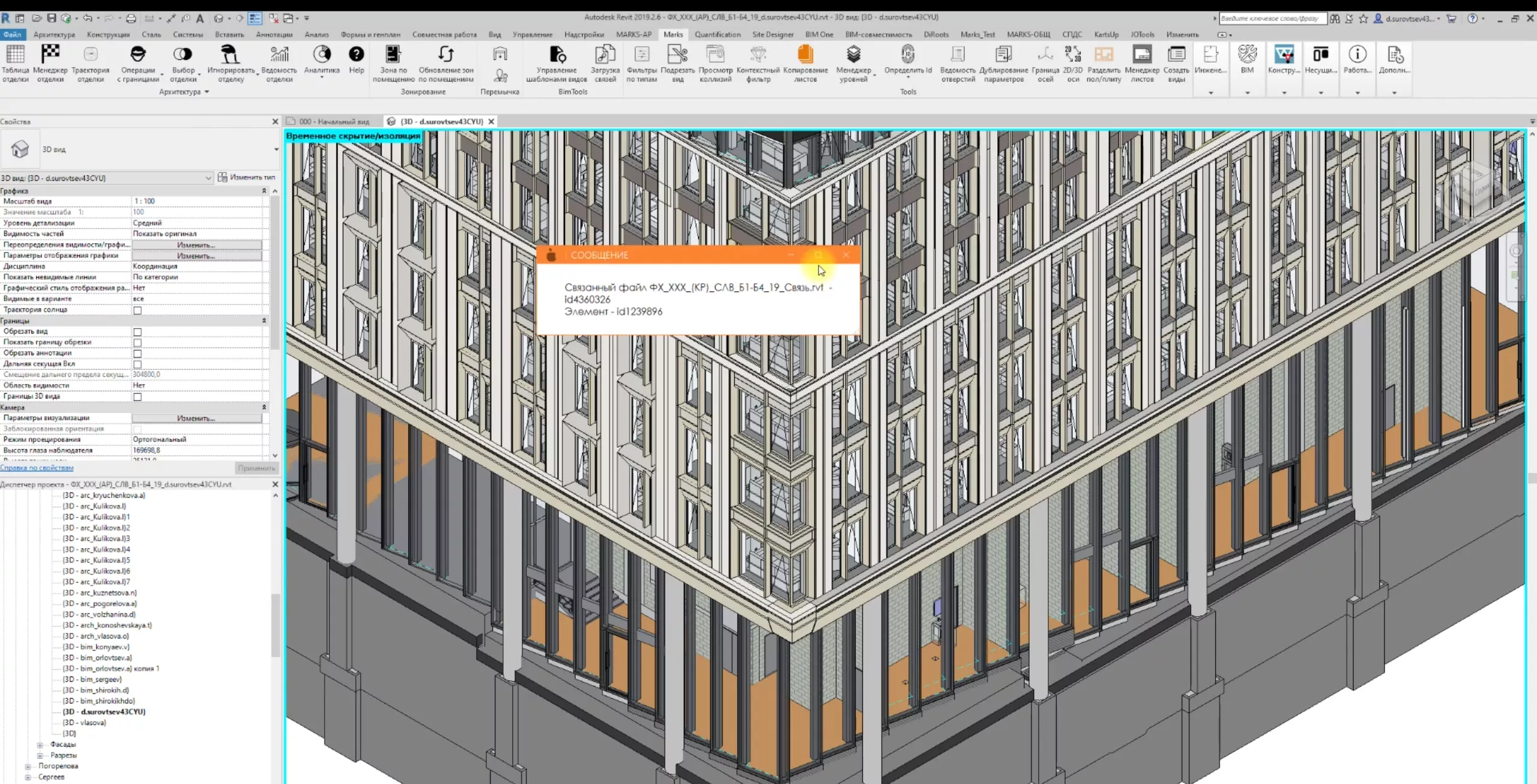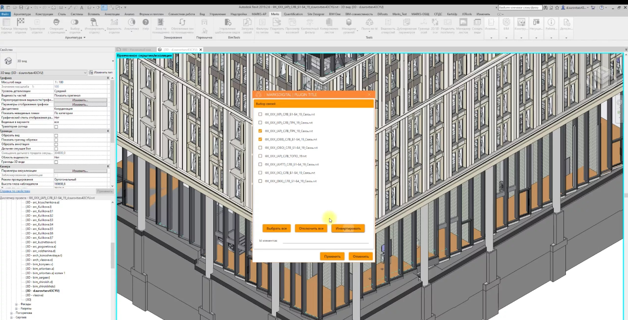 Плагин уведомляет в какой модели расположен элемент и какой у него Id. Также по элементам из связных файлов можно построить вид, на котором оно будет изолирован.
