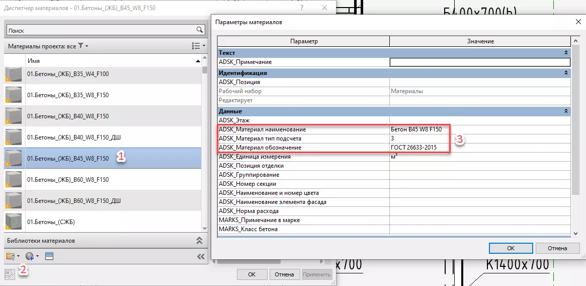 «ADSK_Материал наименование» - имя материала (например, B25 W4 F100)