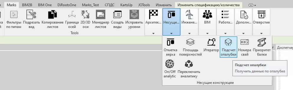 2. Команда «Подсчет опалубки» на вкладке «Marks» на панели «BIM», см. Рис. 2