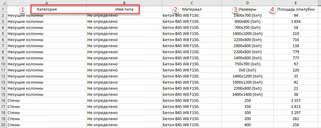 Столбик «B» - это параметр Мрк.ТипКонструкции (или Marks_Тип конструкции). В него необходимо написать истинный (проектный) тип конструкции. Например, в проекте можно формировать «пилоны» как категорией «Несущая колонна», так и «Стена», но использовать имя категории – недопустимо. Поэтому необходимо самостоятельно описать категорию (тип конструкции). Так же в этот параметр можно записывать полное имя типа конструкции.