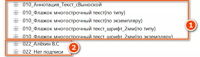 В шаблоне созданы несколько семейств для текстовых примечаний: «010_Аннотация_Текст_сВыноской» и флажков пирогов конструкций: «010_Флажок многострочный текст(по типу)», «010_Флажок многострочный текст(по экземпляру)», «010_Флажок многострочный текст_шрифт_2мм(по типу)», «010_Флажок многострочный текст_шрифт_2мм(по экземпляру)» [1]. А также семейства подписей который могут использоваться в основной надписи и обычном размещении на листах [2] (см. Рисунок 41). По мере необходимости семейства загружаются из библиотеки семейств.