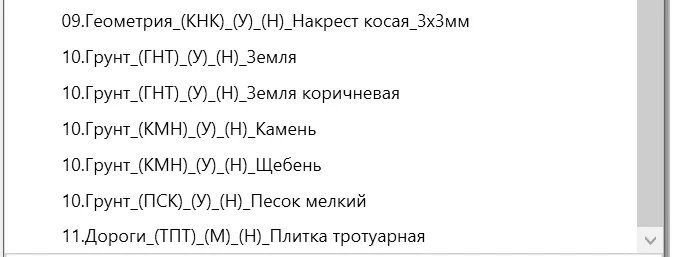Условные штриховки названы согласно правилам именования элементов, разделены на смысловые группы, для облегчения поиска и имеют общий «смысловой» префикс с номером и кодом материала для группировки, например: «02.Кладка_(КРП)», «03.Изоляция_(УТП)»: