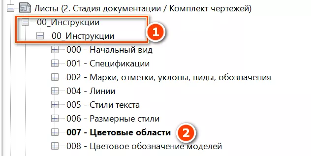 Увидеть, как каждый из компонентов узлов выглядит в проекте (см. Рисунок 47) можно непосредственно в проекте созданном на основе шаблона АР найдя в списке листов лист «007 – Цветовые области» [2] в ветке «00_Инструкции» [1]. (см. Рисунок 46).