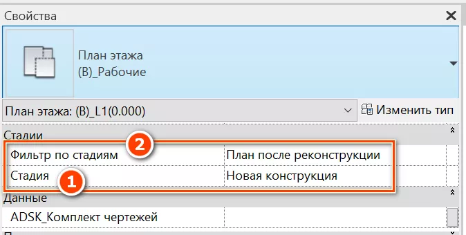 Чтобы построить элемент на конкретной стадии, нужно до его создания настроить вид, на котором вы будете выполнять построение: установить конкретную стадию, например, «Существующие» (по умолчанию установлена стадия «Новая конструкция» [1] см. Рисунок 28). Так, если установить стадию «Существующие», все новые элементы будут создаваться на стадии «Существующие», и т.п.