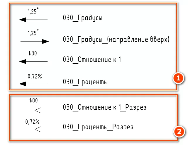 Более детально рассмотреть внешний вид уклонов (см. Рисунок 34) можно непосредственно в проекте созданном на основе шаблона АР найдя в списке листов лист «002 – Марки, отметки, уклоны, виды, обозначения» [2] в ветке «00_Инструкции» [1] (см. Рисунок 34).