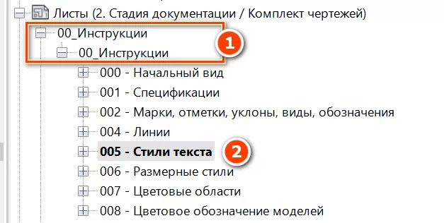 Более детально рассмотреть текстовые стили можно непосредственно в проекте созданном на основе шаблона АР найдя в списке листов лист «005 – Стили текста» [2] в ветке «00_Инструкции» [1]. (см. Рисунок 30).
