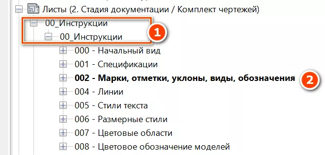 Более детально рассмотреть внешний аннотаций (см. Рисунок 34) можно непосредственно в проекте созданном на основе шаблона АР найдя в списке листов лист «002 – Марки, отметки, уклоны, виды, обозначения» [2] в ветке «00_Инструкции» [1].