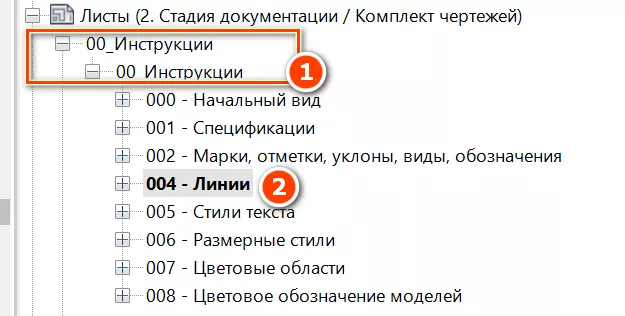Увидеть, как каждый из стилей линии выглядит в проекте (см. Рисунок 16) можно непосредственно в проекте созданном на основе шаблона АР найдя в списке листов лист «004 – Линии» [2] в ветке «00_Инструкции» [1]. (см. Рисунок 15)