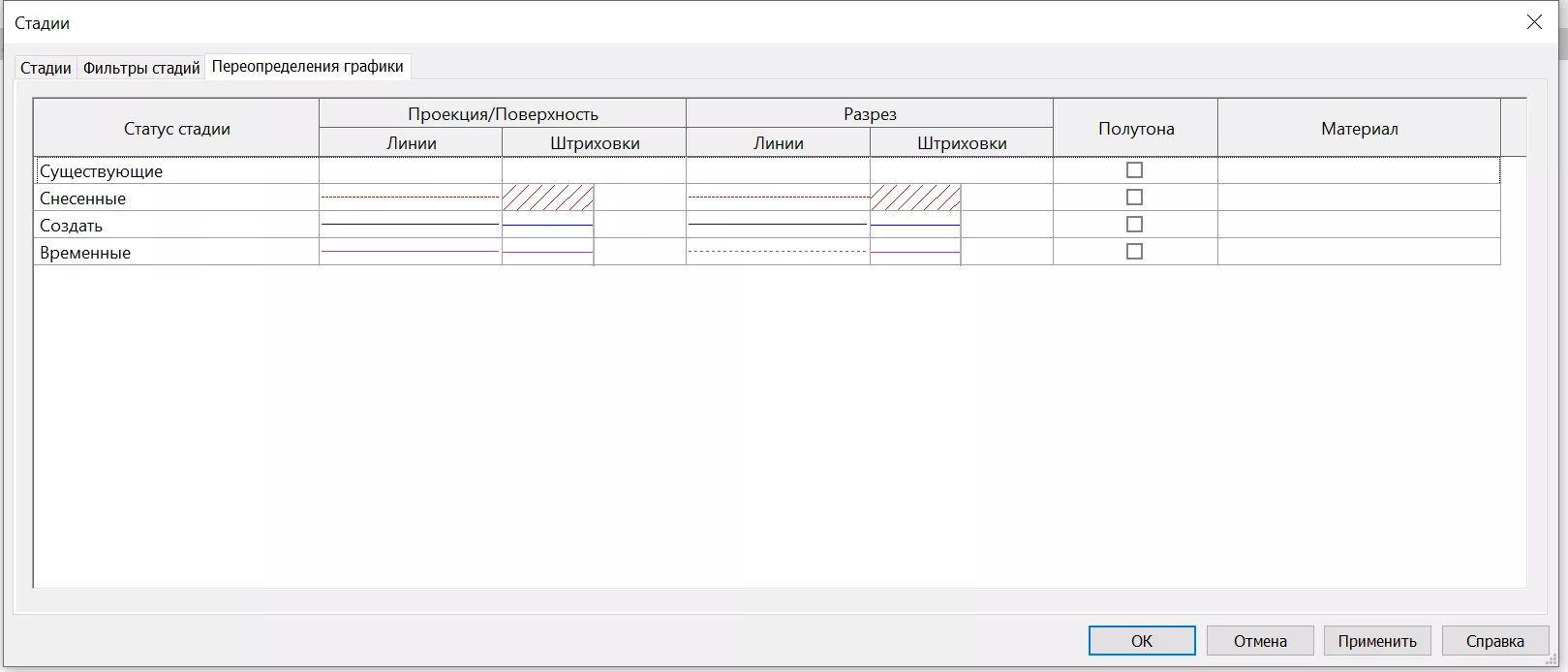 Стадии (Управление - Стадии) – это инструмент, созданный для разделения элементов проекта по времени возведения / сноса.
