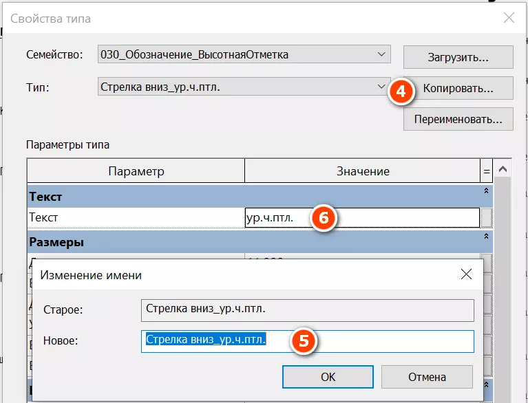 После чего скопировать существующий тип [4], задать требуемое имя [5], и заполнить параметр «Текст», введя туда требуемое значение - «ур. ч. птл.» [6] (см. Рисунок 36).