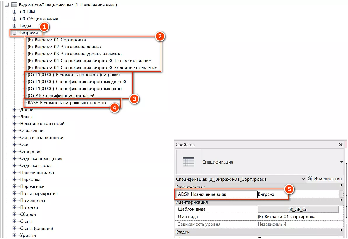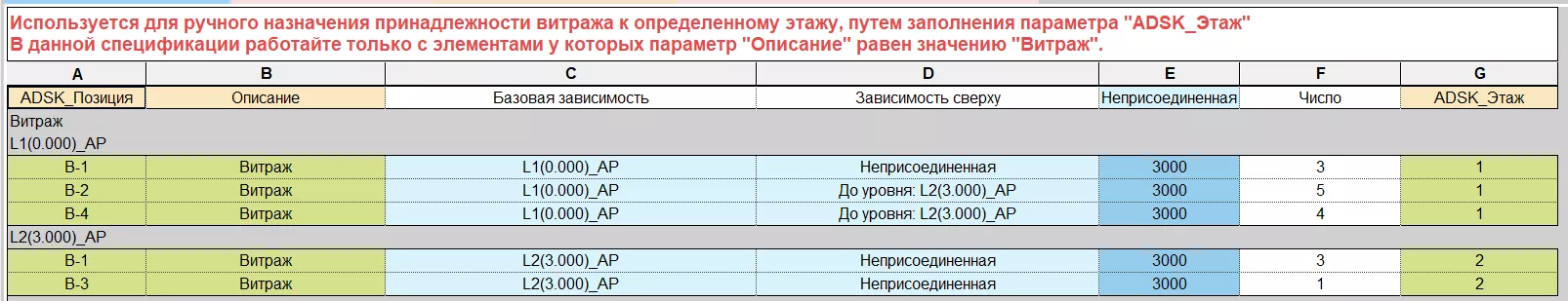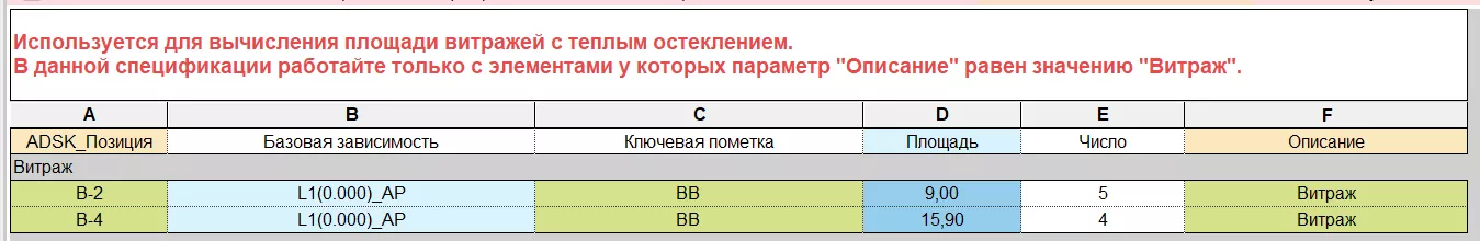 Информация, попадающая в эту таблицу, является результатом заполнения параметров в витражных стенах. Для облегчения заполнения созданы две вспомогательные спецификации: