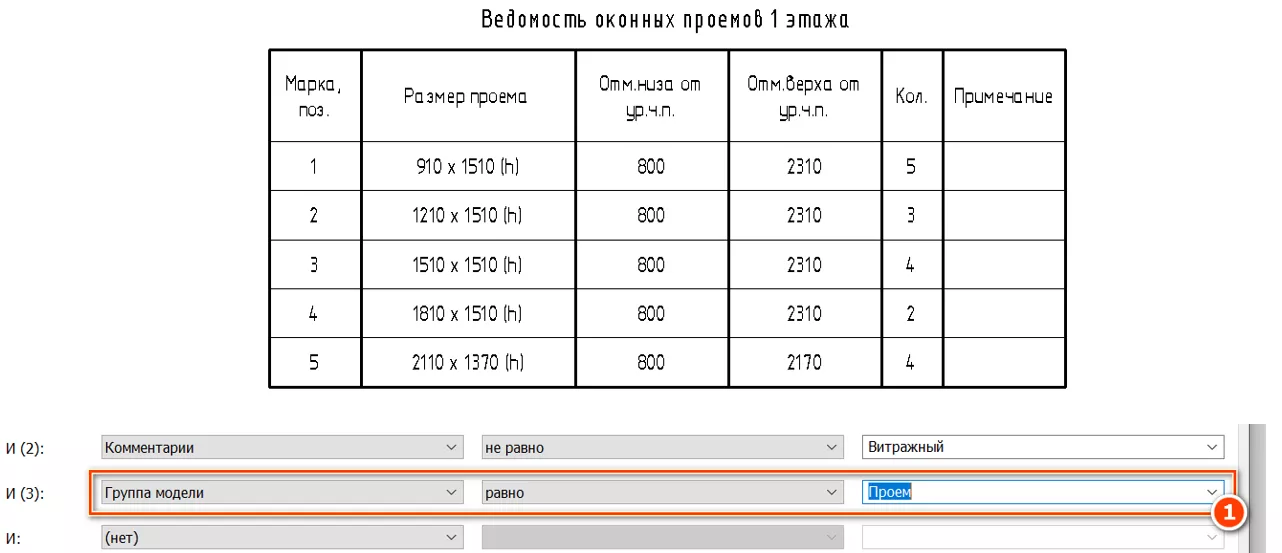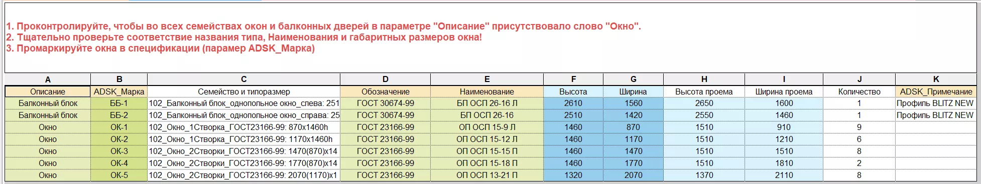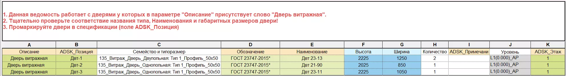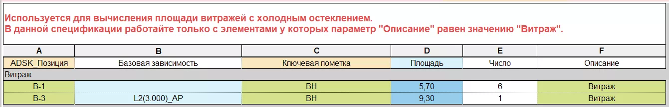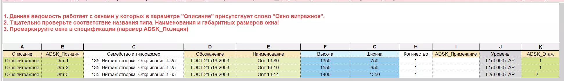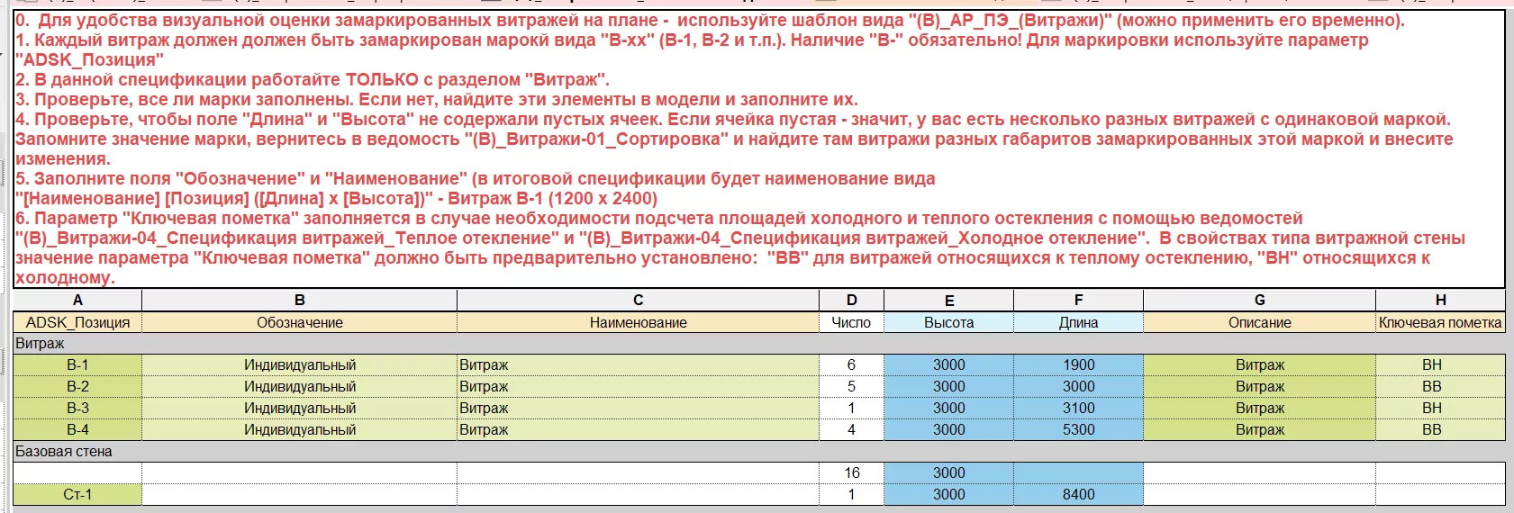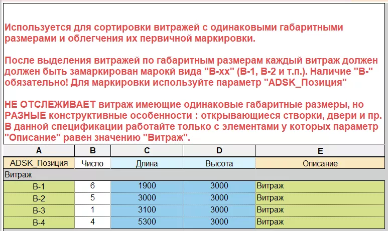 Дополнительная информация содержится в шапке таблицы. Данная таблица группирует витражи по их геометрическим размерам. В проекте два одинаковых по габаритам витража могут иметь различные конструктивные отличия и должны различаться маркировкой. Поэтому не стоит сразу же заполнять значения в столбце «ADSK_Позиция», так как существует вероятность замаркировать совпадающей маркой отличающиеся друг от друга витражи.