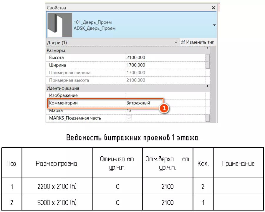 Спецификация «(О)_L1(0.000)_Ведомость проемов_(витражи)» используется для создания ведомости проемов в стенах предназначенных для установки витражей. Для формирования таких проемов используется семейство дверей «101_Дверь_Проем». Для того чтобы отнести данный пустой проем к витражным проемам, следует вписать значение «Витражный» для параметра «Комментарии». Данные проемы попадут в ведомость согласно геометрическим размерам. После чего следует заполнить параметр «Поз.» числами в порядке возрастания.