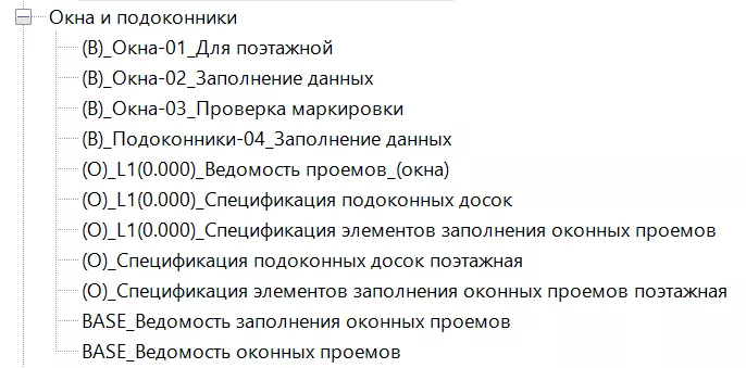 Ветка «Окна» содержит оформленные спецификации заполнения оконных проемов, кладочных проемов, подоконников, а также вспомогательные ведомости для заполнения данных.