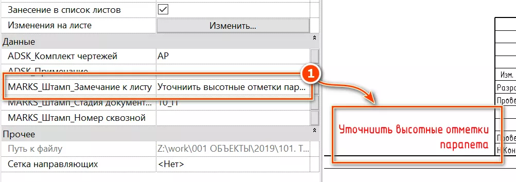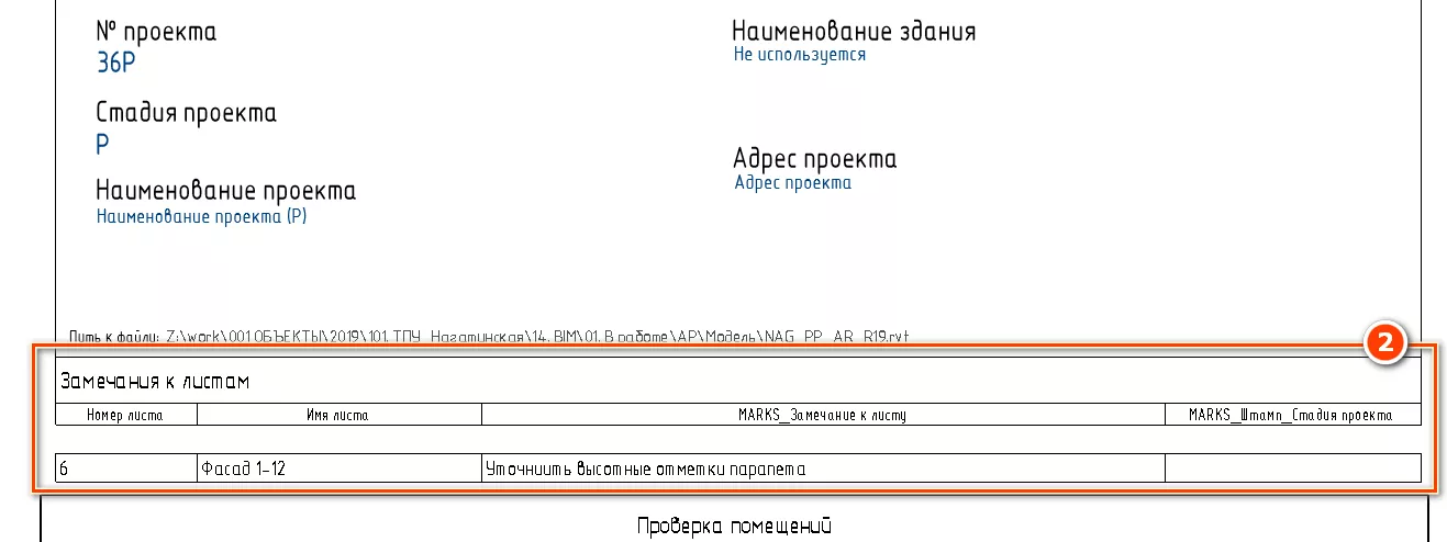 Спецификация (В)_Замечания к листам для стартового вида» располагается на листе «000-Начальный вид» [2] и содержит замечания к листу которые заполняются в параметре «MARKS_Штамп_Замечания к листу» [1] (см. Рисунок 136).