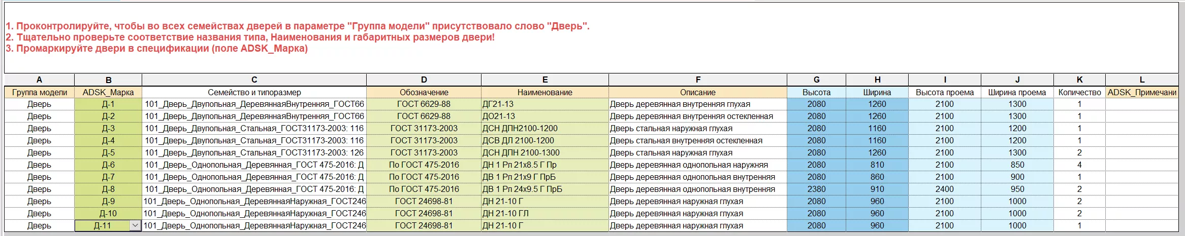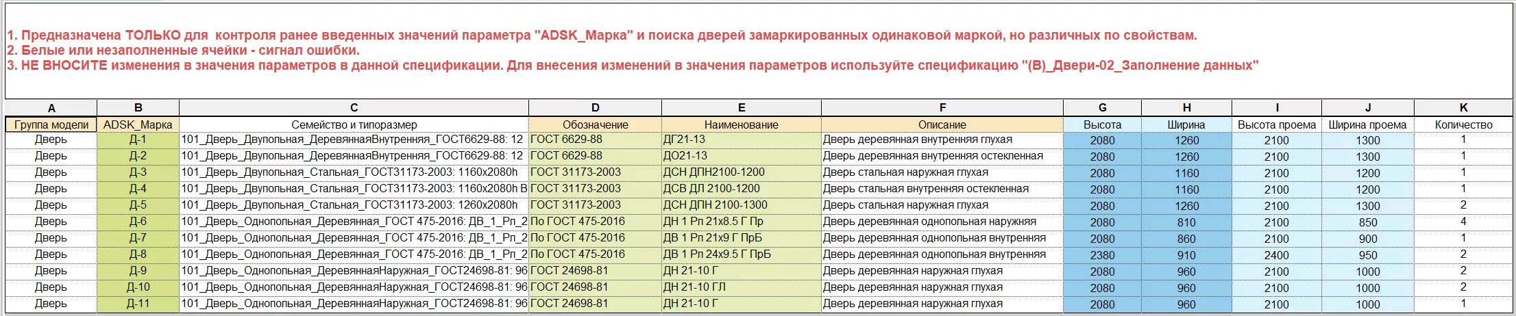 Сортировка и группирование дверей в данной спецификации настроена по параметрам «Описание» и «ADSK_Марка», поэтому при наличии дверей, имеющих одинаковую марку (значение параметра «ADSK_Марка»), но отличающихся по остальным параметрам, результатом группирования будут пустые ячейки на месте различающихся параметров. В этом случае следует вернуться обратно в спецификацию «(В)_Двери-02_Заполнение данных» и внести изменения.