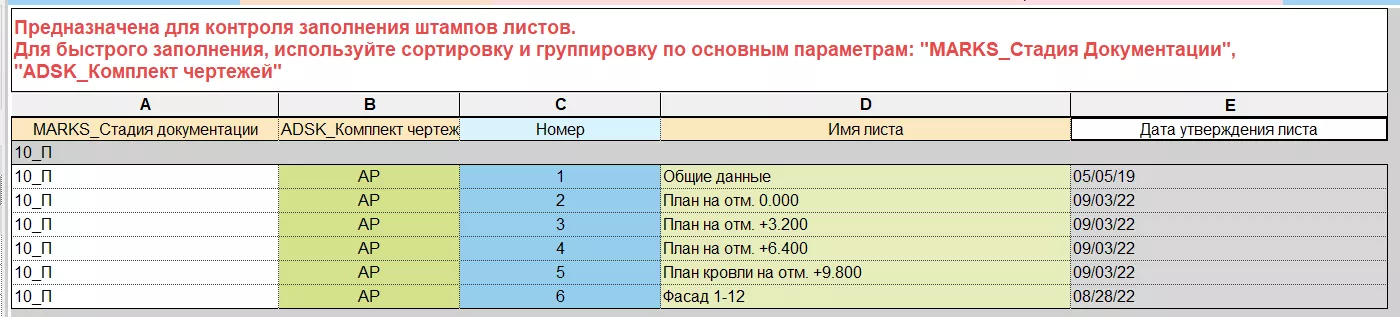 Для облегчения обнаружения видов, размещенных на листах, настроены предупреждения (условное форматирование таблицы): для видов, которые размещены на листах фон ячеек столбца «Номер листа» окрашивается светло-синим, фон ячеек «Имя вида» «Заголовок на листе» «ADSK_Примечание к виду» светло-зеленым, а фон ячеек столбца «Имя листа» окрашивается зеленым (см. Рисунок 119) .