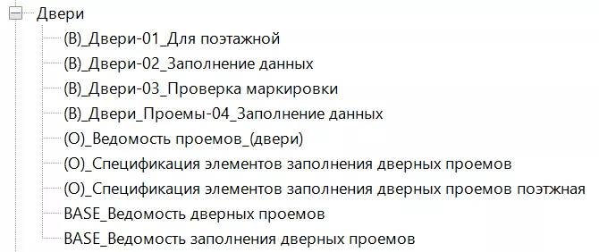 Ветка «Двери» содержит ведомости заполнения дверных проемов, ведомости пустых проемов и вспомогательные ведомости.