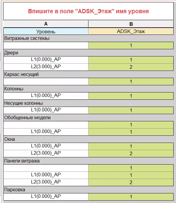 Вспомогательная спецификация «(В)_Этаж_Несколько категорий» (см. Рисунок 138) служит для быстрого заполнения значений параметра «ADSK_Этаж» для множества объектов различных категорий. Параметр «ADSK_Этаж» используется для фильтрации по этажам объектов, не имеющих параметров «Уровень» или «Базовая зависимость». А также для работы с элементами, находящимися в связанных файлах.