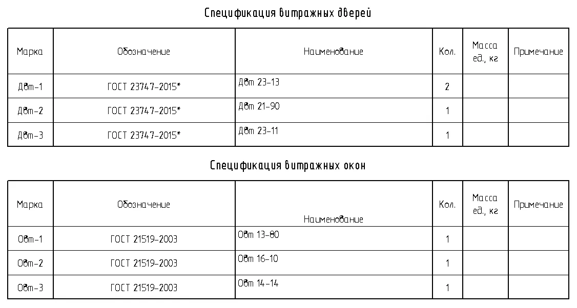 Ведомости витражных дверей «(О)_L1(0.000)_Спецификация витражных дверей» и витражных окон «(О)_L1(0.000)_Спецификация витражных окон» (см. Рисунок 129) формируются по результатам заполнения двух вспомогательных ведомостей: