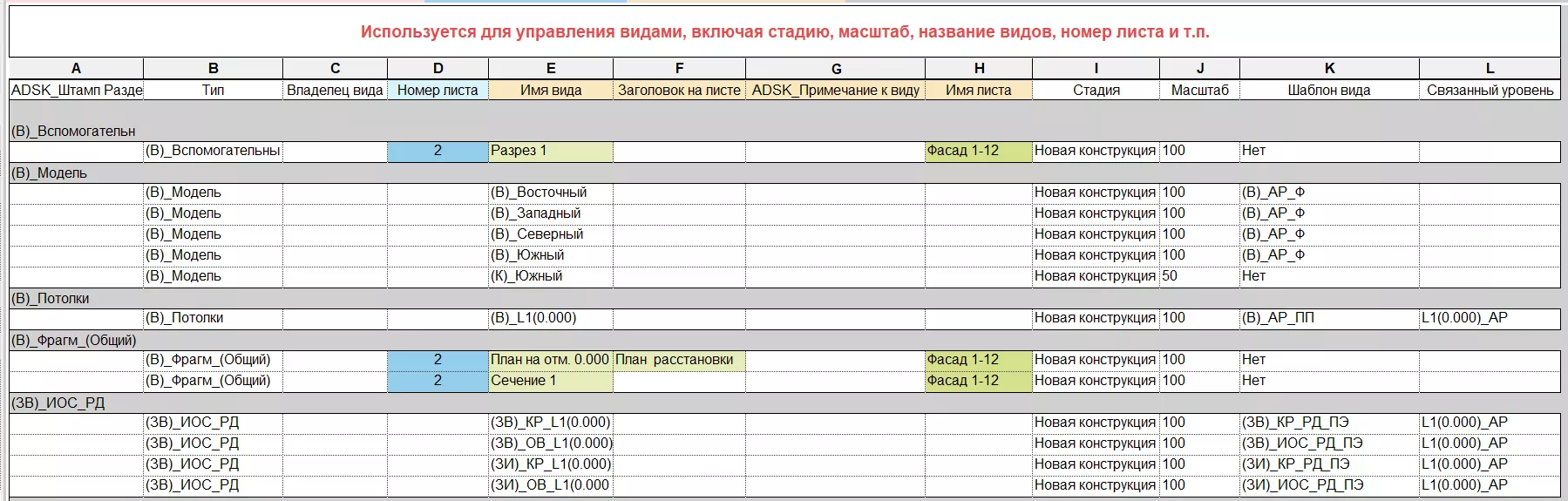 Для контроля и упрощения управления видами в шаблоне создана вспомогательная ведомость «(В)_Виды_Список»