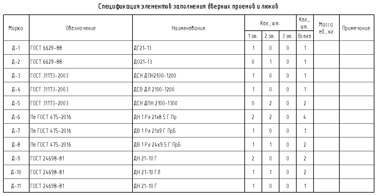 Для получения поэтажной спецификации дверей по ГОСТ используйте спецификацию «(О)_Спецификация элементов заполнения дверных проемов поэтажная» (см. Рисунок 131)