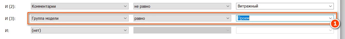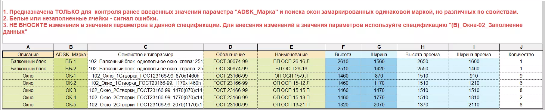 Сортировка и группирование окон в данной спецификации настроена по параметрам «Описание» и «ADSK_Марка», поэтому при наличии окон, имеющих одинаковую марку (значение параметра «ADSK_Марка»), но отличающихся по остальным параметрам, результатом группирования будут пустые ячейки на месте различающихся параметров. В этом случае следует вернуться обратно в спецификацию «(В)_Окна-02_Заполнение данных» и внести изменения.