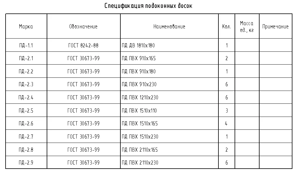 Спецификации окон и подоконников создаются с помощью следующих спецификаций: