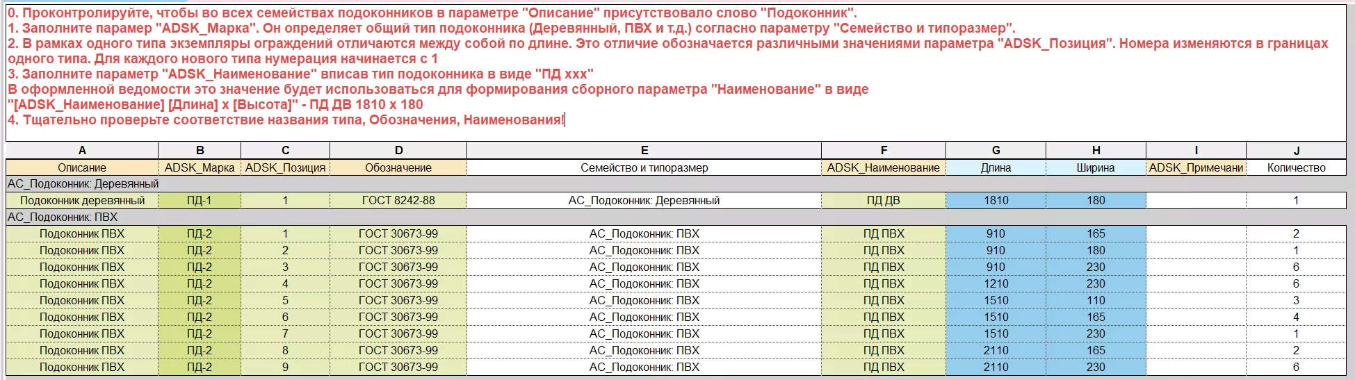Параметр «ADSK_Марка» определяет общий тип подоконника (Деревянный, ПВХ т.д.) согласно параметру "Семейство и типоразмер". Проектировщик заполняет этот параметр ориентируясь на данные столбца «Описание» и «Семейство и типоразмер» (назначая, к примеру для деревянных подоконников марку ПД-1, для ПВХ подоконников марку ПД-2 и т.д.). Для лучшего визуального восприятия типы подоконников разделены с помощью колонтитулов по параметру «Семейство и типоразмер»