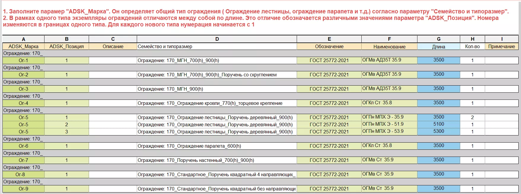 В рамках одного типа экземпляры ограждений отличаются между собой по длине. Это отличие обозначается различными значениями параметра "ADSK_Позиция". Номера изменяются в границах одного типа. Для каждого нового типа нумерация начинается с 1
