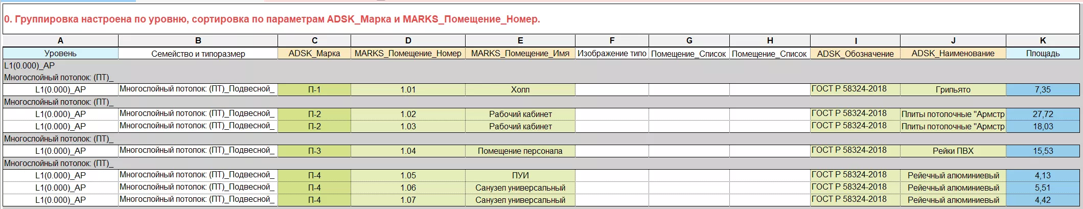 7. Результатом будет являться заполненные спецификаци: «(О)_АР_Экспликация потолков», «(О)_АР_Экспликация потолков_По именам помещений» «(О)_АР_Экспликация потолков_По номерам помещений»