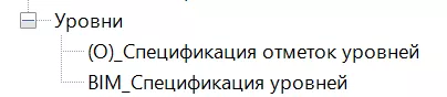 Ветка «Уровни» содержит ведомость уровней модели и вспомогательную ведомость «BIM_Спецификация уровней» предназначенную для контроля уровней со стороны BIM-координатора.