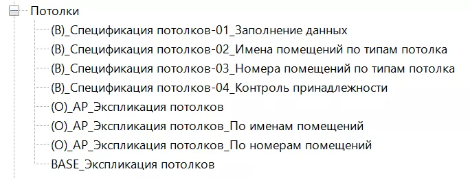 Ветка «Потолки» содержит несколько видов оформленных спецификаций потолков и вспомогательные спецификации: