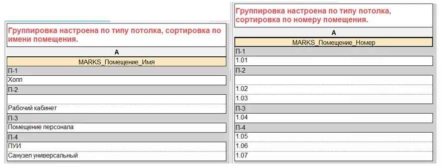 5. Перенесите значения из вспомогательных спецификаций «((В)_Спецификация потолков-02_Имена помещений по типам потолка» и (В)_Спецификация потолков-03_Номера помещений по типам потолка» в ячейки «Помещение_Список номеров» и «Помещение_Список имен» в спецификации «(В)_Спецификация потолков-01_Заполнение данных» (см. Рисунок 170).