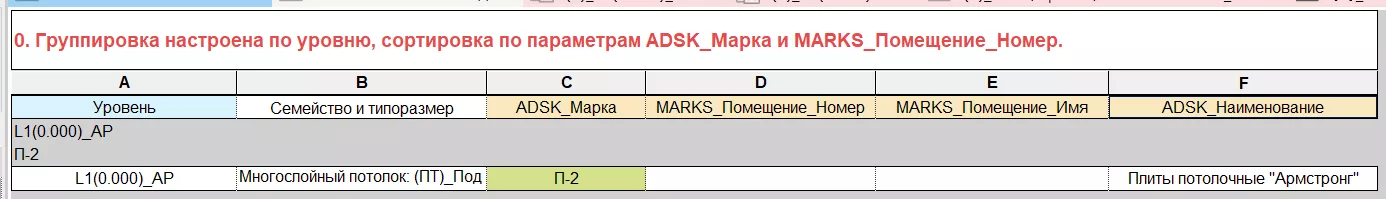 3. Проконтролируйте заполнение всех необходимых параметров в вспомогательной ведомости «(В)_Спецификация потолков-01_Заполнение данных» (см. Рисунок 168).