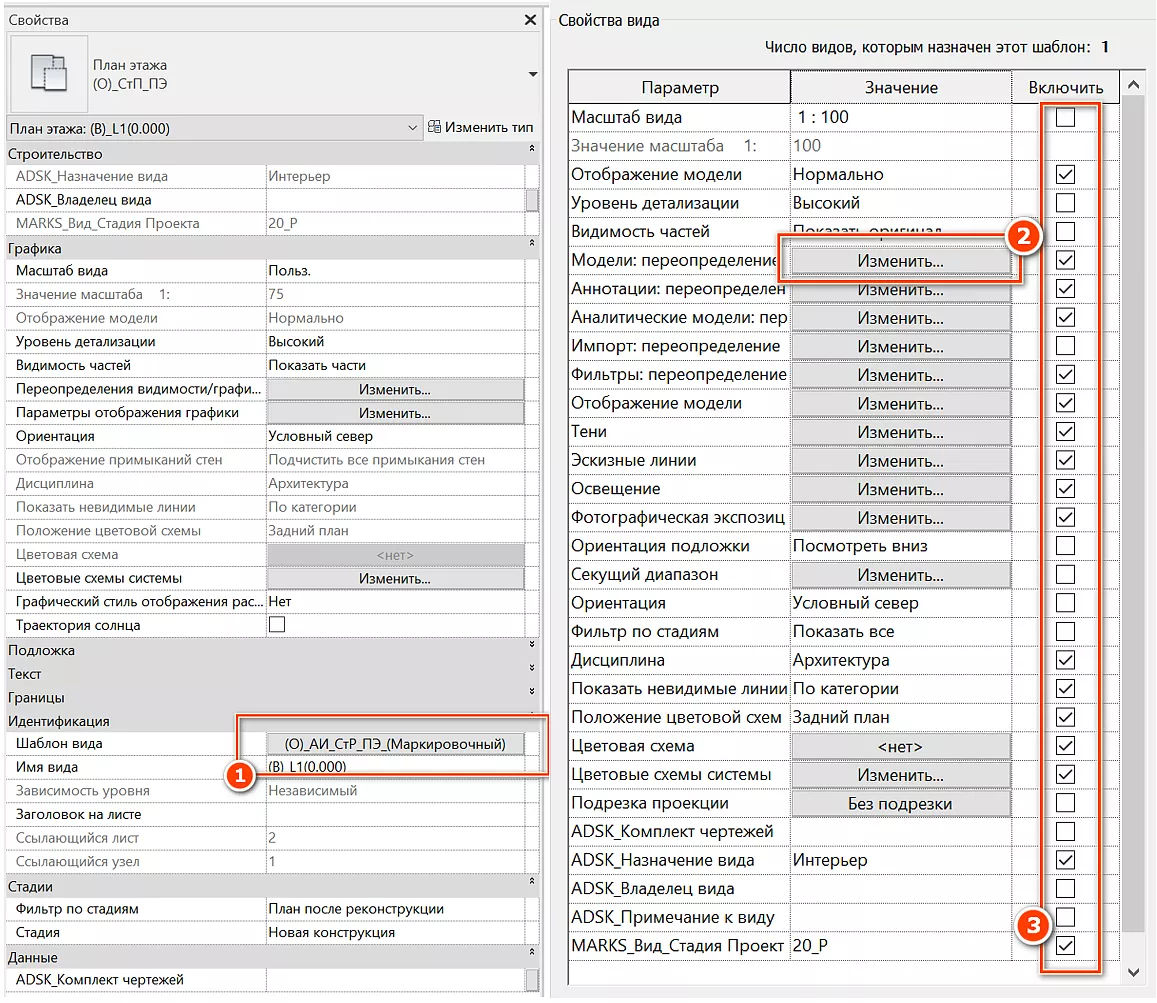 Для изменения настроек шаблона вида, нужно войти в выбор шаблона [1] при активированном виде (либо используя команду «Управление шаблонами видов» [3] ( Вкладка «Вид» [1] - «Шаблоны видов» [2]) (см. Рисунок 96)), а затем настроить нужные свойства [2] или отключить блокирование нужных свойств [3] (на скриншоте разблокирован масштаб вида) (см. Рисунок 108):
