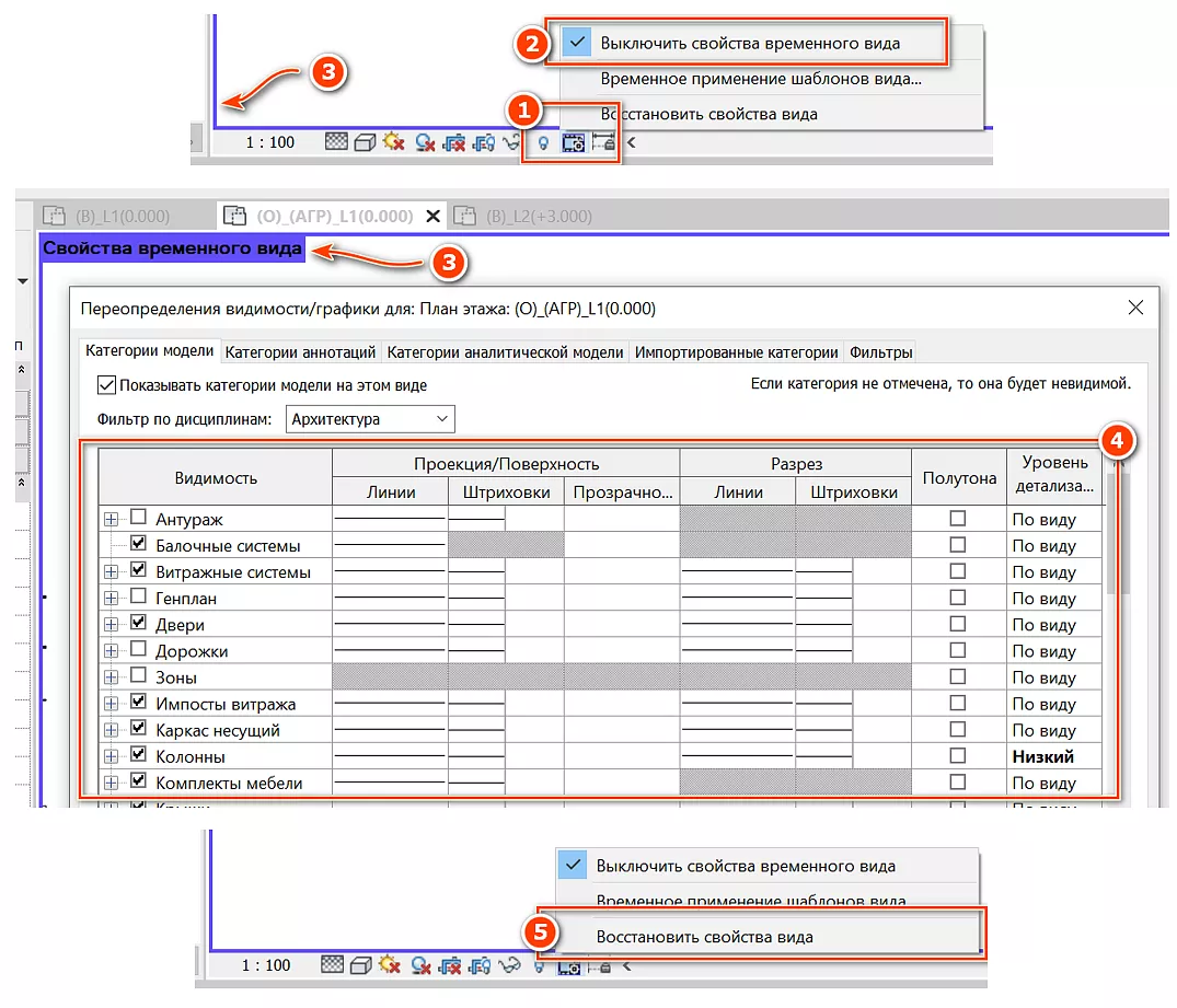 Иногда при работе с видами, к которым уже применен шаблон, бывает необходимо временно отключить какую-либо категорию или изменить настройки графики. Для этого не нужно редактировать основной шаблон, отключать его от вида способом, описанным выше, достаточно временно отключить шаблон с помощью команды «Свойство временного вида» [1] - «Выключить свойства временного вида» [2], при этом по контуру экрана вида появится фиолетовая рамка [3], а параметры, заблокированные шаблоном вида, разблокируются [4]. Вернуть прежние настройки можно с помощью команды «Восстановить свойства вида» [5] (см. Рисунок 110).
