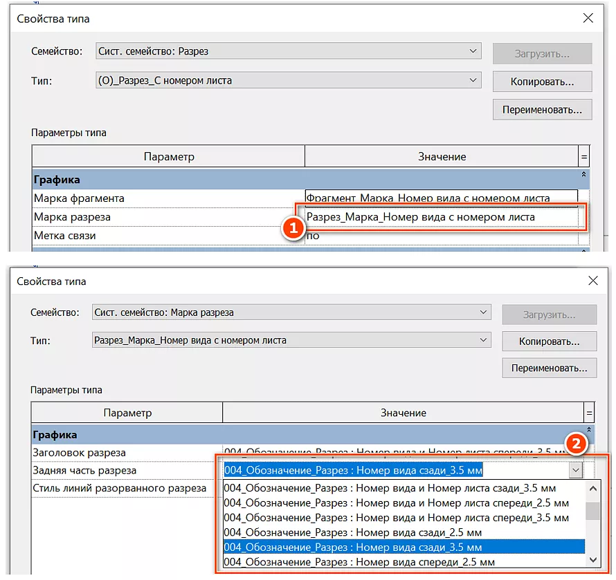 Номер разреза или фасада можно изменить в параметре «Номер вида» [1], параметр «Номер листа» [2] заполняется автоматически согласно номеру листа, на котором находится данный разрез. (для этого нужно выделить вид разреза на листе). Внимание! Значение параметра на одном листе должно быть уникальным! (см. Рисунок 103)