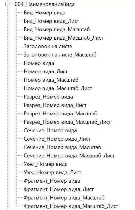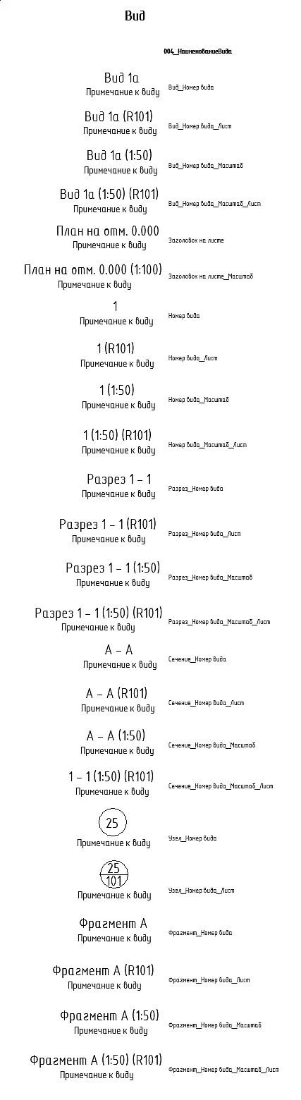В имени типа марки присутствуют имена параметров, которые выводятся данной маркой. Некоторые типы марок содержат префикс явно указывающих для каких типов видов предназначена марка. Префиксы: «Разрез_», «Сечение_», «Узел_», «Фрагмент_» указывают на марки, применяемые только для этих типов видов. Остальные марки, не имеющие префикса, а также марка с префиксом «Вид_» являются универсальными.