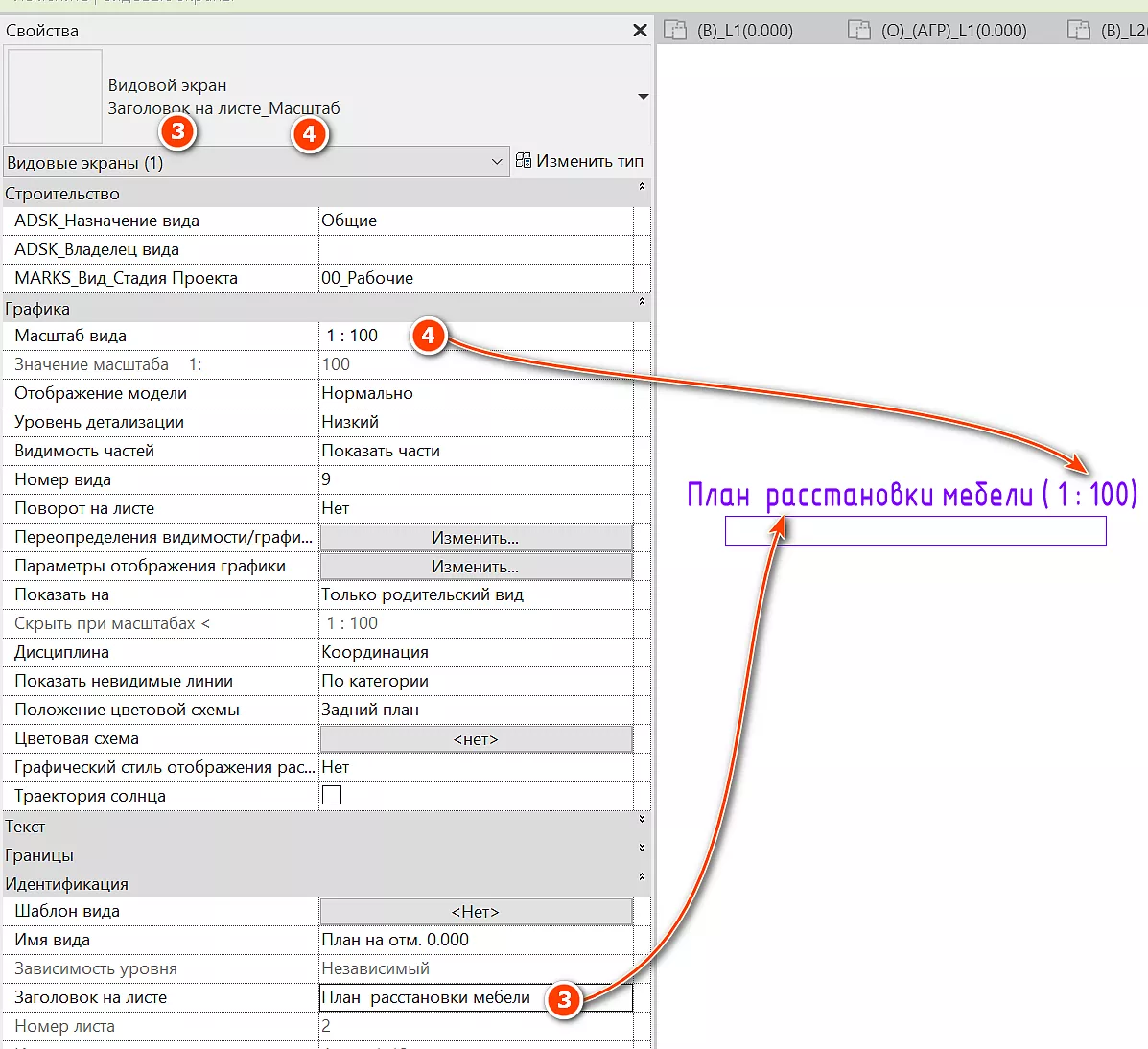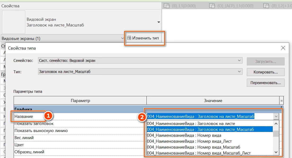 Значение параметра «Заголовок на листе» [1] и значение параметра «Масштаб вида» [2] в скобках.