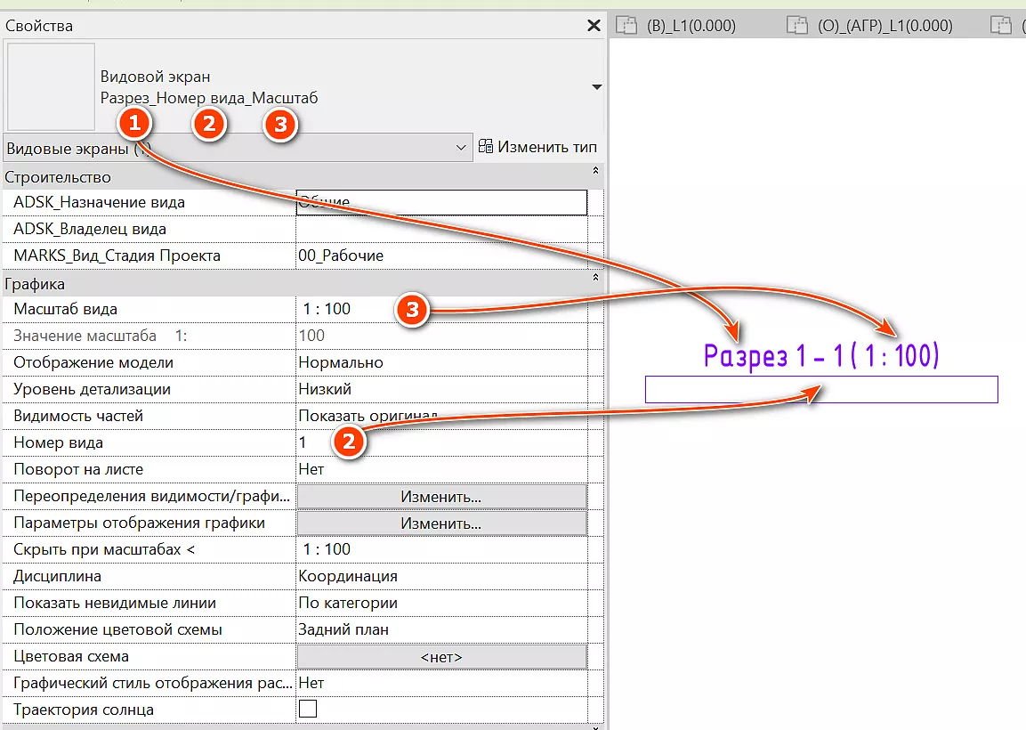 Слово «Разрез» [1], значение параметра «Номер вида» [2] и значение параметра «Масштаб вида» [3] в скобках.