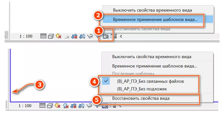 Также при работе с видами возникает необходимость просмотреть, как будет выглядеть оформленный вид с тем или иным примененным шаблоном. Для этого не нужно применять шаблон с помощью параметра вида «Шаблон вида», а следует воспользоваться командой «Свойство временного вида» [1] - «Временное применение шаблона вида» [2] и выбрать требуемый шаблон вида в появившемся окне. При этом по контуру экрана вида появится фиолетовая рамка [3]. Если в процессе работы к виду временно применялось несколько шаблонов, то они заносятся в список и доступны для быстрого переключения [4]. Вернуть прежние настройки можно с помощью команды «Восстановить свойства вида» [5]