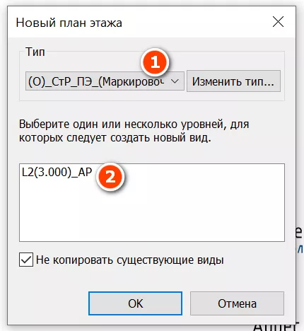 Вы должны выбрать типоразмер плана [1] (кладочный, маркировочный…) и уровни, виды которых нужно создать [2] (см. Рисунок 100).