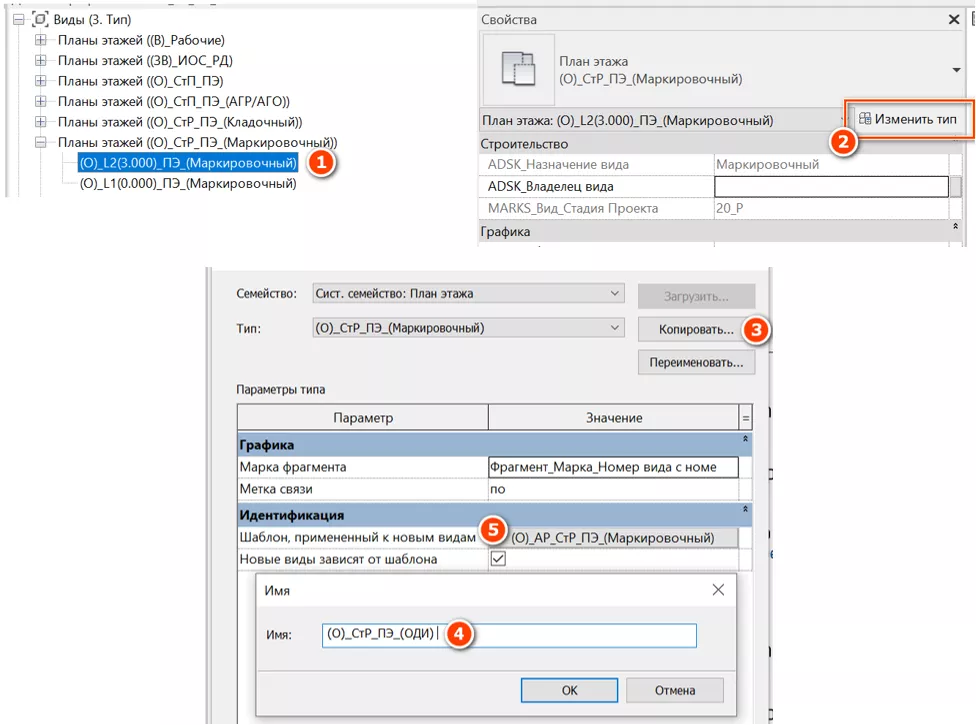 Для организации видов в диспетчере проекта или фильтрации можно сделать копию типоразмера вида (не путать с копией вида). Для этого следует выделить вид в диспетчере проекта [1] и нажать «Изменить тип» [2] (см. Рисунок 105), затем «Копировать» [3] и «Переименовать» [4], а затем настроить новый типоразмер вида (маркировку, шаблон вида и проч.).