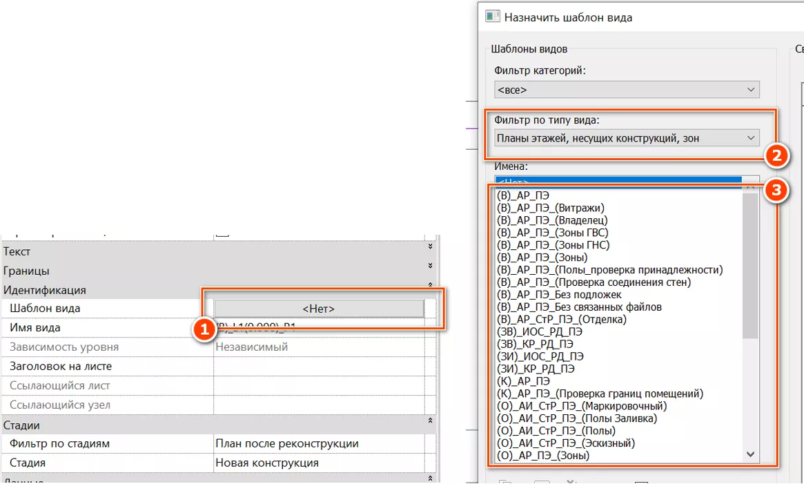 Как уже упоминалось ранее, у определенных типов видов выставлен шаблон, применяемый при создании нового вида данного типа. Пользователь может создать свой тип вида, которому при создании не назначается шаблон вида. Для таких видов следует назначить шаблон. Щелкнуть по кнопке с надписью <Нет> у параметра «Шаблон вида» [1] и выбрать требуемый шаблон из списка [2]. (см. Рисунок 107).