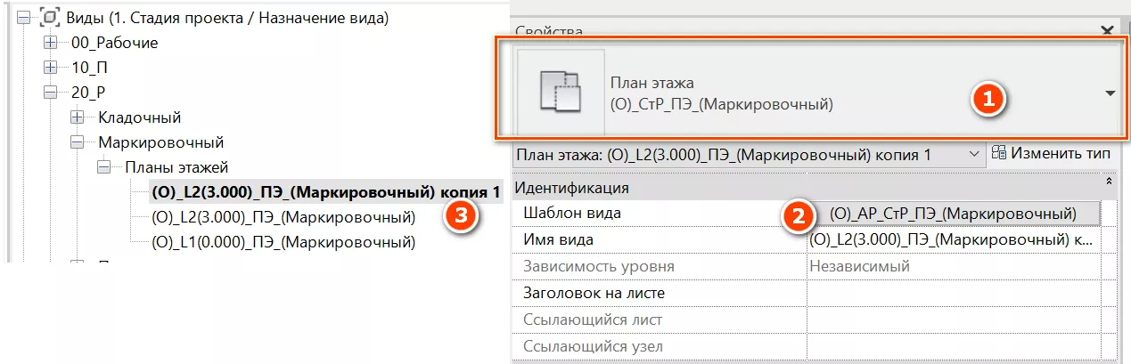 Второй вариант создания планов - копирование существующих видов. После создания копии, необходимо самостоятельно изменить типоразмер вида [1] и назначить шаблон вида [2] и переименовать вид согласно требуемой задаче (см. Рисунок 102).