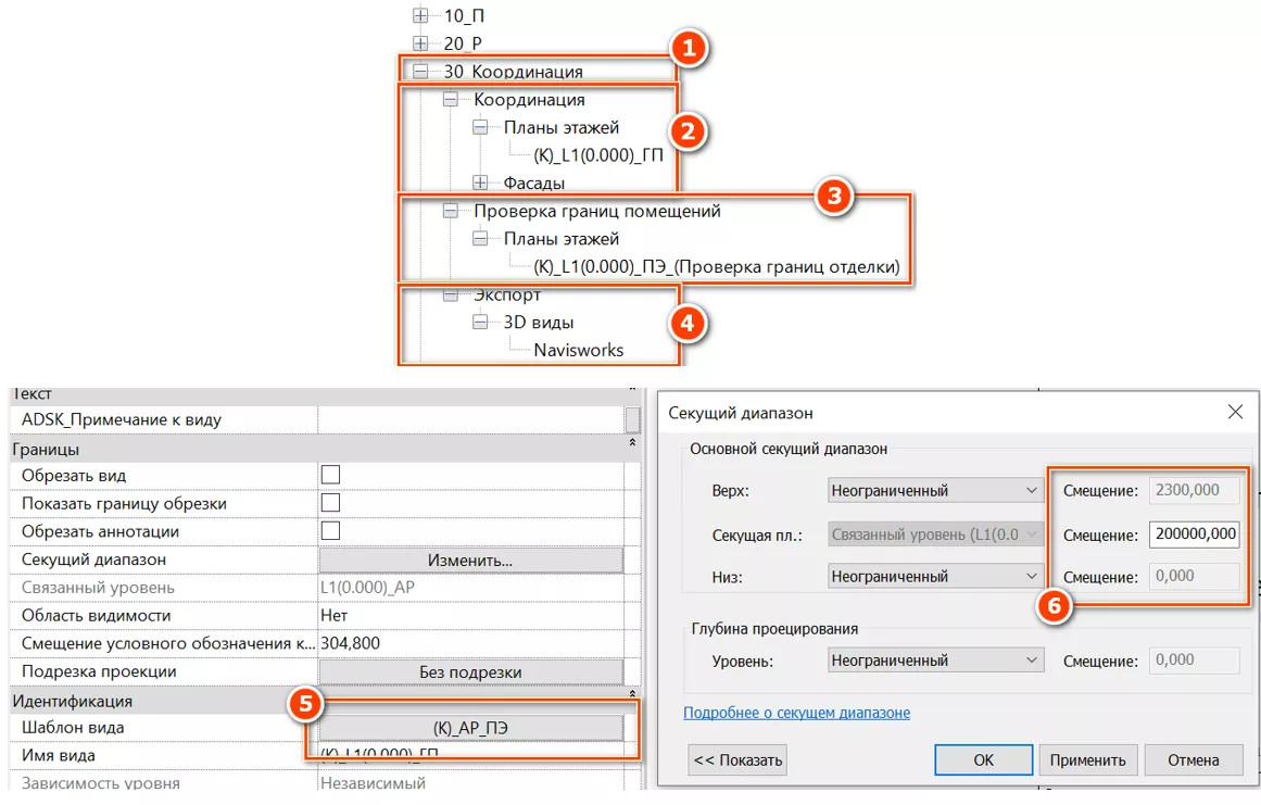 Вложенная ветка «Координация» [2] содержит координационный вид «(К)_L1(0.000_ГП» с назначенным координационным шаблоном вида [5] (содержащим отображение базовой точки проекта) и настроенным секущим диапазоном позволяющим видеть отображение модели в плане целиком, без сечения на определенном уровне [6].